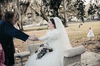 Before the ceremony began, there was a traditional "kabbalat panim" where the bride received her guests. The groom also received guests, however they were separated from each other. This was a beautiful moment where family and friends had the opportunity to offer their congratulations and well-wishes to the bride. The bride was seated in the most gorgeous of settings, underneath a live oak on an ornate chair, and guests came up to her one by one, offering gifts and kind words.